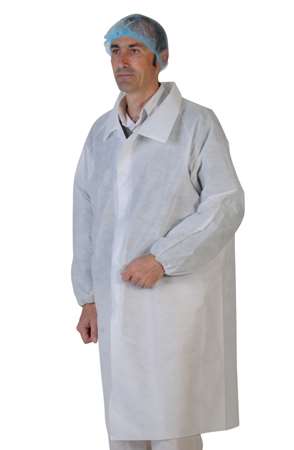 Blouse polypropylène non tissé blanc 30 g/m², col classique cousu, fermeture par 4 pressions, avec élastiques aux poignets